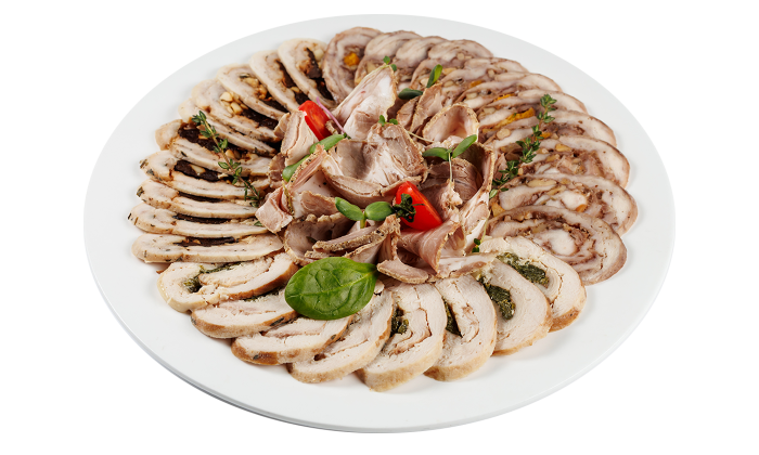 Рулетик из цукини с начинкой из сливочного сыра и оливок, рулетик из сладкого перца с начинкой из сыра фета, рулетик из баклажана с начинкой из сливочного сыра, чеснока и томатов.