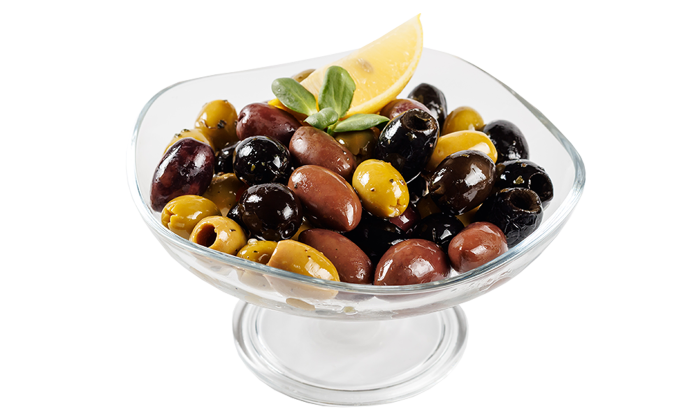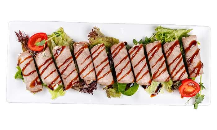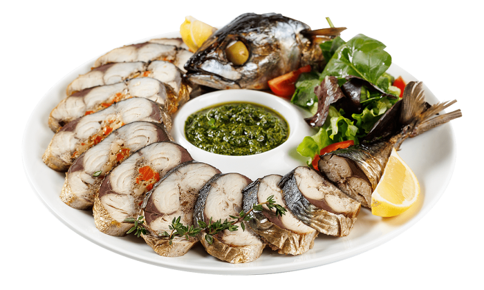 Рулет из скумбрии с лимонной цедрой слабого посола, рулет из скумбрии с начинкой из пряной зелени, маринованный красный лук, оливки, маслины, лимон, соус песто.