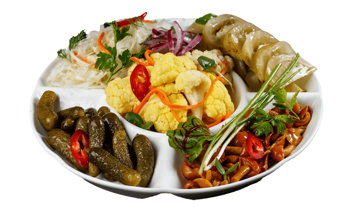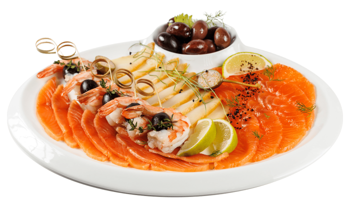 Волованы с икрой, с креветкой, с лососем, профитроли с ветчиной, профитроли со сливочным сыром и чесноком, канапе с сыровяленой колбасой, канапе с сырами и ягодами.