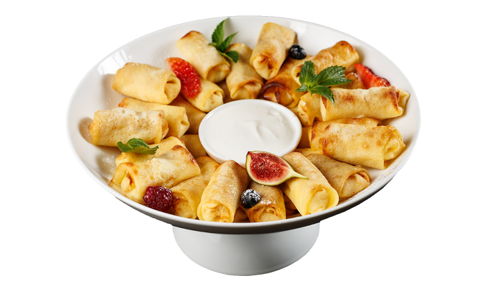 Горячие блины с творогом и изюмом, подаются со сметаной. Оформление заказа за 3 дня.