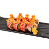 Ролл с начинкой из хрустящей креветки, огурца, сливочного сыра, сверху икра тобико, креветочный пикантный соус, икра лососевая.