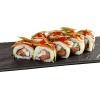 Ролл с начинкой из хрустящей креветки, огурца, сливочного сыра, сверху икра тобико, креветочный пикантный соус, икра лососевая.