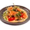 Хрустящие гренки, руккола, яйца пашот, соус Голландский, лосось слабосоленый, маслины. с 10:00 до 12:00