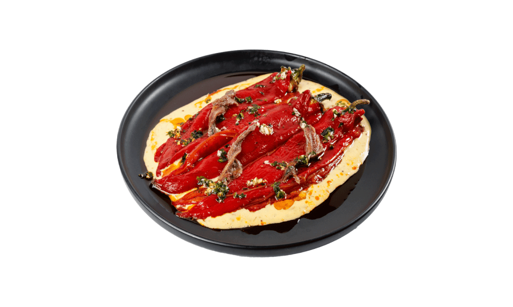 Печёный перец в сочетании соусом Вителло Таннато и маринованными анчоусами